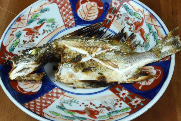 チョウセンバカマの塩焼き 水洗いして水分をよく切る。塩をして1時間以上寝かせて焼き上げる。塩をして数日寝かせてもいい。味はややイサキに似て鶏肉のように締まる。ほんのり甘味があってとても味わい深い。クリックで閉じます![]()