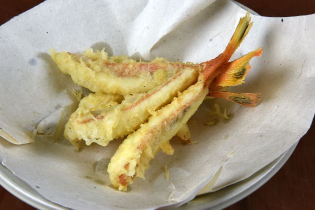 アカゴチの天ぷら 身は明らかにコチ科に近い。非常に上品な白身でやや繊維が粗く、筋繊維自体も密ではない。単に塩焼きなどよりも油を使っての料理に向く。また皮目には独特の風味があることなどから天ぷら種として優れている。やや高めの温度で短時間で揚げて美味。
