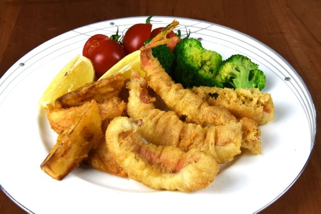 アカゴチのフィッシュ&チップス アカゴチは三枚下ろしにする。尾鰭はキレイなのでどちらかにつけたままにした方がいい。これをビール、サラダ油、小麦粉の衣で短時間で揚げる。同時にジャガイモも揚げて添える。さくっとした食感で軽い。ジャガイモを添えているのでランチなどに最適。クリックで閉じます![]()