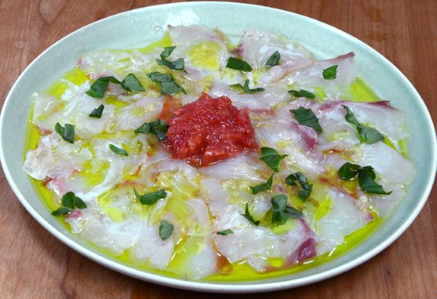 ハマフエフキのカルパッチョ 小型が向いていると思う。大型の脂ののったものだったら、脂のない背の部分を使うべきだ。皿ににんにくをなすりつけてオリーブオイルを塗っておく、ここに振り塩をする。水洗いして三枚に下ろして皮を引く。できるだけ薄く切りつけて、皿に貼り付け、スプーンなどでとんとんと馴染ませる。好みの野菜などをのせて上からもオリーブオイルを振る。クリックで閉じます![]()