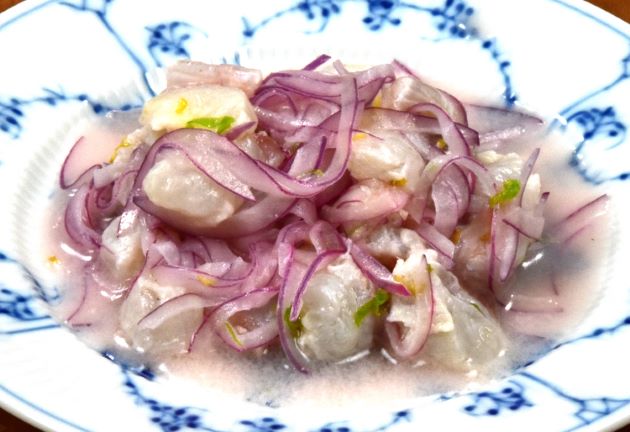 ハマフエフキのセビチェ 刺身にしたときに余ったものや、小振りのものを使うといい。細かく切り、紫玉ねぎ、辛い唐辛子、塩、ライムジュースでマリネする。味が回ったら出来上がりである。ちょっと塩辛いくらいがうまい。ジンなどスピリッツに合う。クリックで閉じます![]()