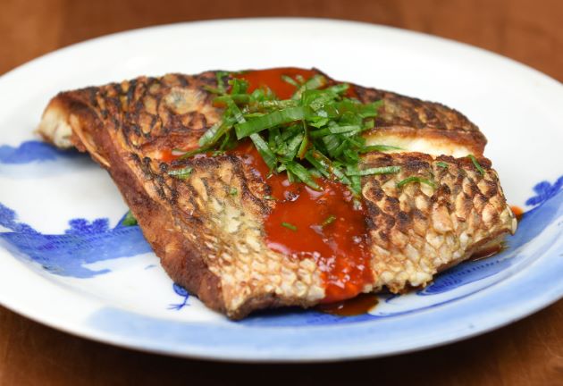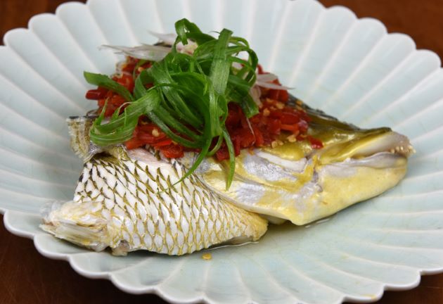 ハマフエフキの蒸魚(清蒸) 皮にうま味があり淡泊な熱帯・亜熱帯系の魚にいちばん向いているのが、蒸魚である。強火で蒸し上げると、皮がゼラチン質になり、身が豊潤に上がる。これを甘辛い中華ダレ(醤油・紹興酒・魚醬少々・砂糖・八角ほんの少し。中国醤油でも)で食べる。吻から鰓蓋にかけての皮はねっとりとして甘く、身は豊潤で柔らかい。
