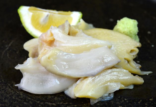 モスソガイの刺身 宮城県で「あわびつぶ」と呼ばれるのは、刺身で食べてアワビに優るという意味合いがあるのだろう。食感のよさはアワビにひけを取るが身の甘味と貝らしい風味では決して負けていない。