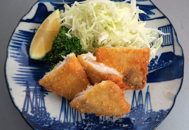 クロアジモドキのフライ 非常に上質の白身で、熱を通しても硬く締まらない。フライ材料として優秀だ。三枚に下ろし切り身にして塩コショウする。このとき皮を引いてもいいし、引かなくてもいい。これに小麦粉をまぶしてバッター液(溶き卵でも)をくぐらせ、パン粉をまぶし短時間で揚げる。非常にうまいフライになる。クリックで閉じます![]()