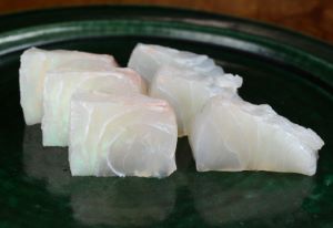 皮付きのまま氷水に落とし、水分を切って刺身状に切る。