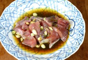 骨なしの方は腹骨・血合い骨を取り、立て半分に切る。