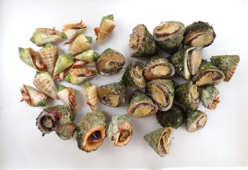 ニシキウズ貝(ニシキウズガイ)、ニガニシ(キナレイシ)、カタベ貝(カタベガイ)、チャンバラ貝(マガキガイ)だ。