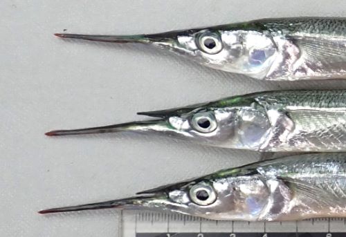 ダツの仲間がいちばん両顎が長く伸びていて、サンマがいちばん両顎が短い。