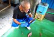 9月27日の朝、水揚げが大方終わったあとに『古満目水主大敷組合』、福見真路さんが隅の方で何かをやっている。割り箸、竹のヘラ、ラジオペンチでクロホシフエダイの内臓を抜いているのだ。聞くと「かけのいお」を作っているのだという。「掛けの魚」のことで、「掛魚」ともいう。2尾腹合わせにした魚を家内、もしくは建物のどこかに掛けて供物とする。掛けるのは干した魚であることもあるし、生の魚を掛けることもある。大皿などに2尾の魚を抱き合わせただけで済ませる地域もある。農家や、漁家、商家などで行われているが、農家は五穀豊穣、商家は商売繁盛、漁師の場合、豊漁を祈願し、また豊漁の礼として供える。年内のえびす講、正月、小正月など行われるが、職業で時期は違っている。古満目では年度替わりの10月に新しいものに替えるのだという。今回はクロホシフエダイだが魚はなんでもいい。塩漬けにしてからからに干して「おみきすずり」に掛ける。「おみきすずり」の「お神酒」はわかるが「すずり」がわからない。