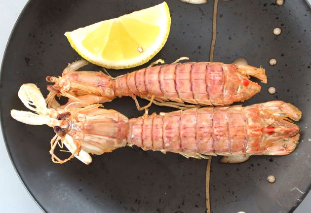 体長24cmを超える大型のシャコ。最後尾の節に青い帯が縦に走り褐色の丸い斑紋がある。