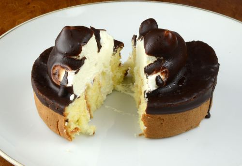 周りが少し硬い生地で中がカステラ、上にクリーム(これなんていうんだろう)で頭を造り、繋がった目と鼻と尾がある。