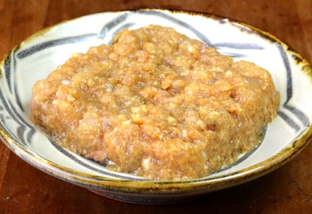 ウミタナゴやマルタ(ウグイ)など様々な魚で作られる。アイナメは水洗いして三枚に下ろして腹骨・血合い骨を取り、皮を引く。にんにく、ねぎ、みそと一緒にたたく。