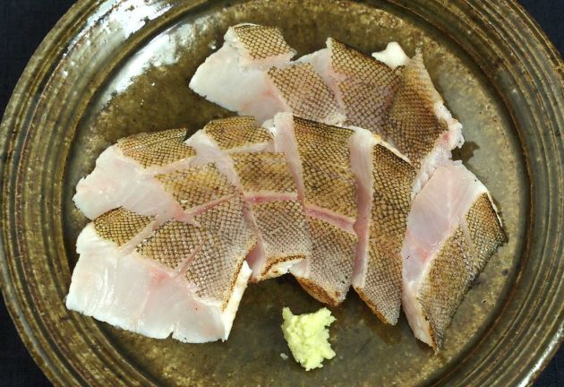 アイナメの刺身 鮮度が落ちやすいので野締めは避けたい。三枚に下ろして皮を引き、単純に刺身にしたもの。これは2kg弱を福島県郡山市にある郡山水産が血抜きして送って来てくれたもの。いちばん脂ののった初夏の個体で、血抜き3日くらいまではあっさりしすぎているが、4日目からうま味がぐんと増してきた。うま味が豊かで脂に甘味がある。