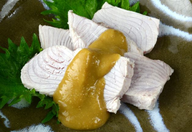 身を刺身状に切りつける。食べやすい大きさに切り、塩を入れた湯に一瞬通す。氷水に落として粗熱を取り、水分を切る。酢みそが合う。