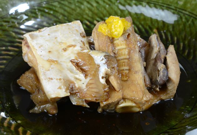 煮つけやすい大きさに切り、一度湯通しする。冷水に落として霜降りにして、水分を切る。酒・砂糖・醤油・水でややこってりと煮つける。