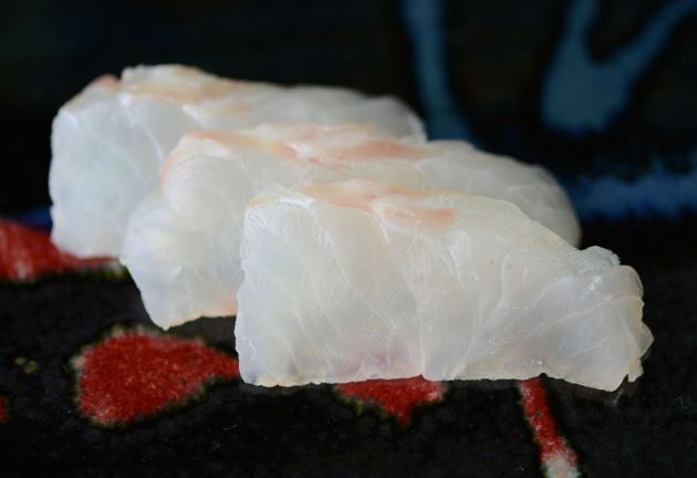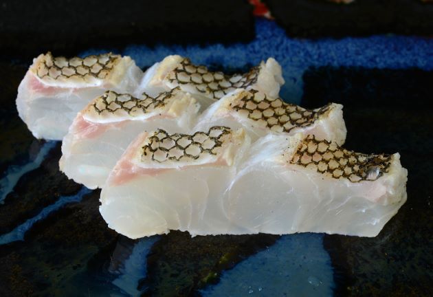 アオバダイの焼霜造り 透明感のあるきれいな白身ではあるが、やや味は単調。それを補ってくれるのが皮だと思う。ただし湯をかけて皮霜造にしても厚みのある皮は硬いのでバーナーであぶる。三枚に落として今回は背の部分の皮を上にしてバーナーであぶり、氷水に落として粗熱をとり、水分を拭き取って刺身状に切る。クリックで閉じます![]()