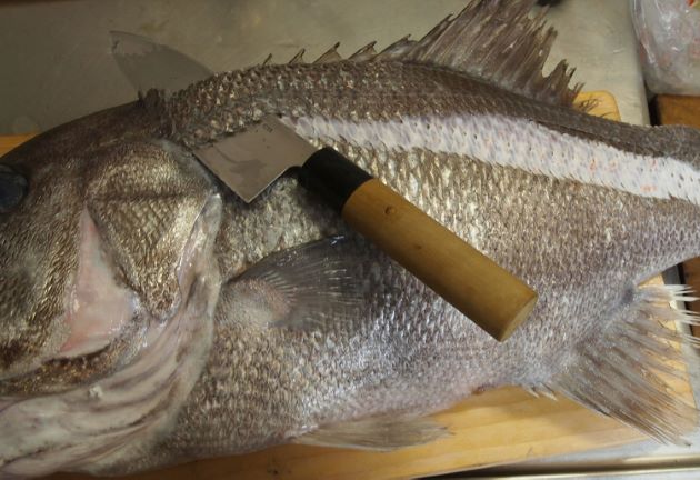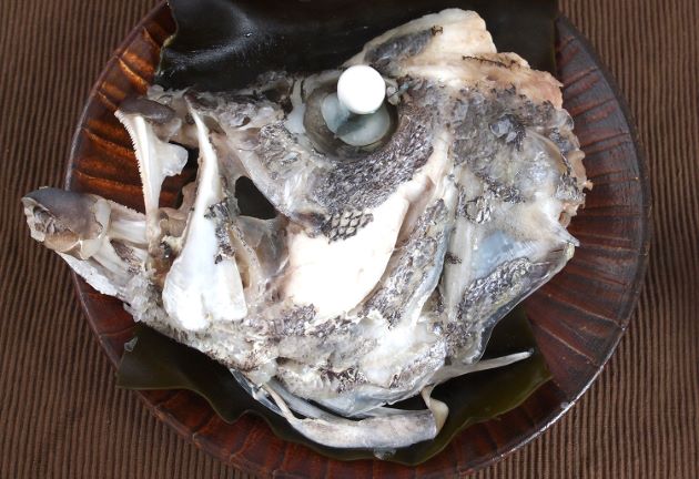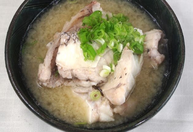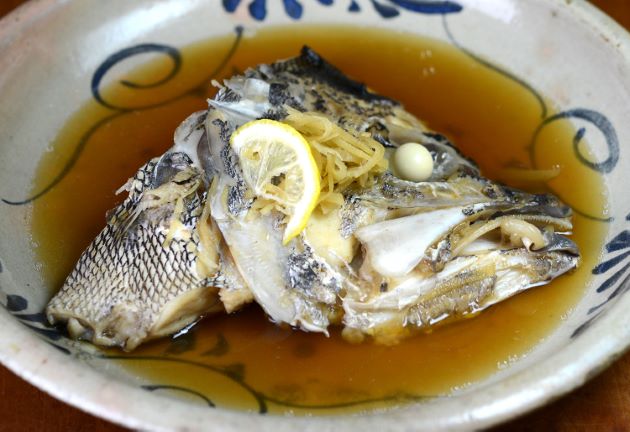 アオバダイの兜煮 本種の頭部は体幹部分に対して他に類を見ないほど大きい。水洗いして頭部を梨子割りにする。湯通しして冷水に落として残った鱗やぬめりを流す。水分をよくきり。酒・みりん・醤油・水を沸かした中で煮る。醤油は最初控えめにし、徐々に加えていく。頭部からは非常にうま味豊かなだしが出る。身や皮をこの煮汁にからめながら食べる。ご飯がすすむ。クリックで閉じます![]()