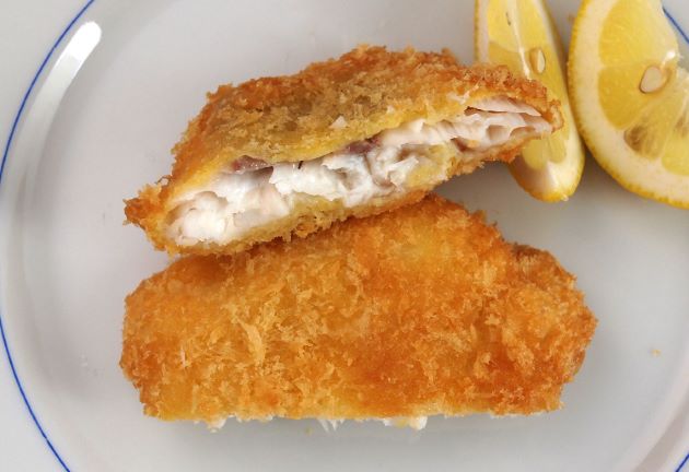 アオバダイのフライ 水洗いして三枚に下ろして皮を引く。血合い骨・腹骨を取り、切り身にする。塩コショウして小麦粉をまぶし、衣(小麦粉・卵・水、溶き卵でもいい)をからめてパン粉をつけて上げる。くせのない白身で上げると身が豊潤になる。とても美味。クリックで閉じます![]()