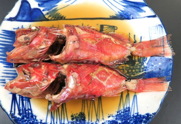 アカカサゴの煮つけ 水洗いして湯通しして冷水に落として、鱗などをきれいに取る。これを昆布だし(水でもいい)にしょうゆ(薄口)、みりん、酒で煮つける。煮ると身が締まり、やせるが上質の白身なので、できるだけ薄味にする方がうまい。
