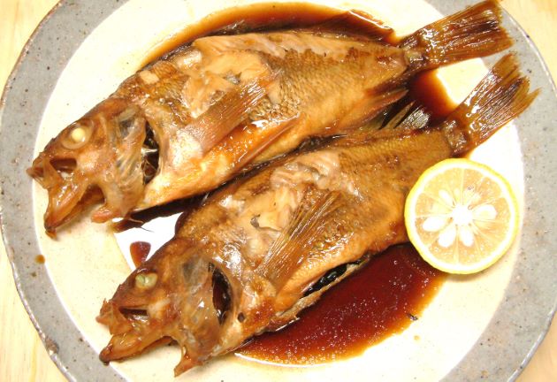 アカガヤの煮つけ 本種のもっとも基本的な料理法である。非常に上品な味わいで、ほどよく繊維質で身離れがいい。身に味がある。