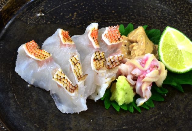 イズカサゴの刺身 活魚なら刺身がイケル。水洗いして三枚に下ろして血合い骨を抜く。皮を引いてできるだけ薄くそぎ造りにする。肝や皮、胃袋などは湯引きして添える。強い食感のなかにほの甘さがある。わさびじょうゆでもいいし、ポン酢で食べてもいい。ねぎを薬味に食べてもいい。クリックで閉じます![]()