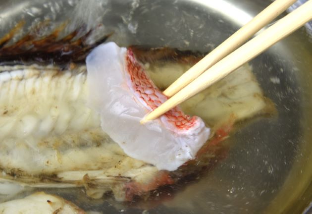 イズカサゴのしゃぶしゃぶ 1 水洗いして三枚に下ろす。頭部、中骨などをこんがり焼く。身は皮付きのまま腹骨・血合い骨を取り、薄く切る。中骨などと昆布を煮だして塩と酒で味つけする。ことことと温めながら身をしゃぶしゃぶして好みの火の通し加減で食べる。