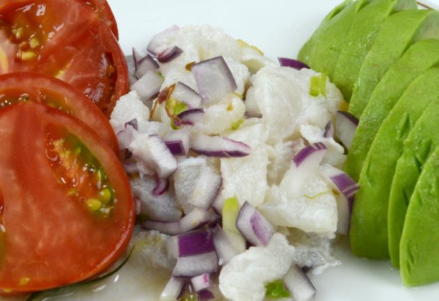 イズカサゴのセビチェ 異型の魚なので刺身などにすると無駄が出やすい。これを小さく切り、ライムと塩でしめる(マリネー)、紫玉ねぎ、辛い青唐辛子を加えて和えて少し置く。柑橘系の酸味で爽やかな味わい。トマトや豆類、アボカドなどを合わせるといい。スピリッツ(テキーラ)と合う。クリックで閉じます![]()