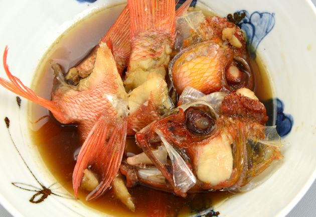 イズハナダイのあら煮(煮つけ) あらなどを集めて置く。小さいものは丸のままでもいい。湯通しして氷水に落として残った鱗やぬめりを流す。水分をよくきり、酒・砂糖・醤油(控えめに)・水が沸騰した中に入れる。砂糖などは好みで。みりんを使ってもいい。身離れがよく皮においしさがある。クリックで閉じます![]()