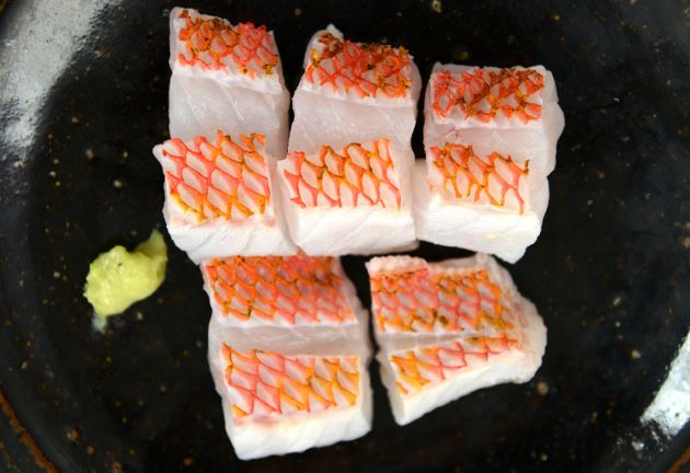 イズハナダイの皮霜造 料理店などでは皮霜造だが、日本各地で「湯がけ」などさまざまな呼び名があるので、地元の呼び名で読んで戴きたい。水洗いして三枚に下ろす。血合い骨・腹骨を取り、水分をよくきっておく。皮目を上に、ぬれ布巾をかけて湯をかける。布巾は必ずしも必要ではないが、皮が不必要に反り返るのをふせぐ。これを氷水に落とし粗熱をとって水分をよくきる。刺身状に切って食べるのだけど、酢みそ、一味唐辛子に醤油なども合う。