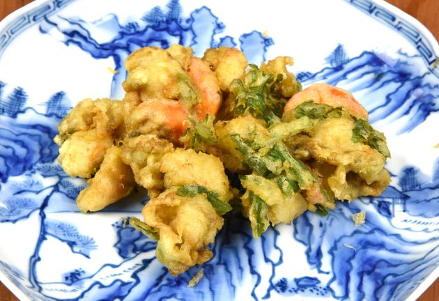 焼きイタヤガイ 小振りの個体の貝柱、ヒモ(外套膜)、生殖巣などを集めて置く。水分をていねいに取る。貝柱は適当にきり、小麦粉をまぶし、衣をまとわせて高温で短時間揚げる。揚げかたによっては貝柱が硬くなるのが難点であるが、非常に濃厚なうま味と貝らしい歯触りでやたらにうまし。クリックで閉じます![]()
