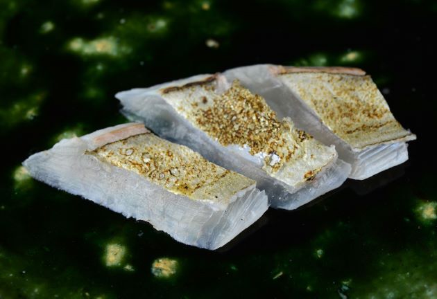 水洗いして三枚に下ろす。腹骨を取り、腹身だけにする。皮をあぶって氷水に落として粗熱を取る。水分をとり、冷蔵庫で寝かせ、皮を落ち着かせて切る。