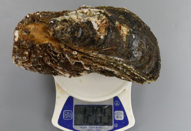 殻高(画像の天地)20cmを超える。形は長楕円形ではあるが様々。貝殻は分厚く、表面は薄い板状が重なり合い、1キロ近い重さがあるものもある。[長崎県産養殖]