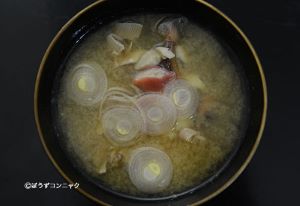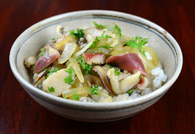 ホッキ貝のみそ汁 剥き身にし、水管などの砂を洗い流す。足の元にある内臓を指で押し出して取り、水から煮てみそをとく。実際に作って見ると、アサリほどではないがうま味豊かなだしが出て美味。[北海道釧路市]クリックで閉じます![]()