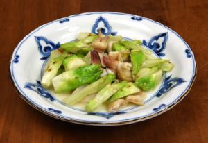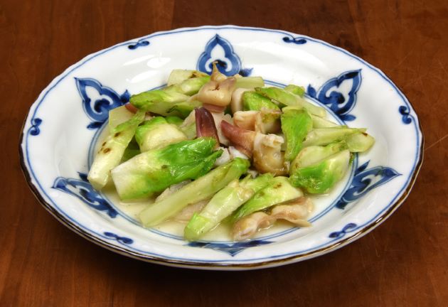 ホッキガイの中華炒め(ウバガイの中華炒め) 中華風に塩味で炒めてみた。剥き身にして処理をし、適当に切る。野菜は適当に切っておく。油に塩を加えて熱し、しょうが、ねぎの風味をつけて野菜と本種を炒める。仕上げに味見してコショウを振る。本種は油脂を使った料理にとても向いている。クリックで閉じます![]()