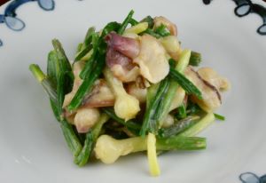 ホッキガイのぬた(ウバガイのぬた) 基本的に剥き身にして湯引きする。ひも、貝柱、足などを適当に切る。ノビルなど好みの野菜はゆでて、冷水に落として水分をよくきり、適当に切る。これを酢みそ(みそ・酢・砂糖、野菜によっては辛子)で和える。クリックで閉じます![]()