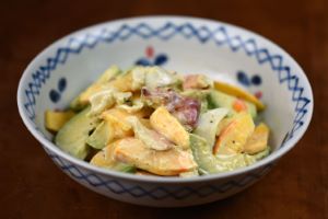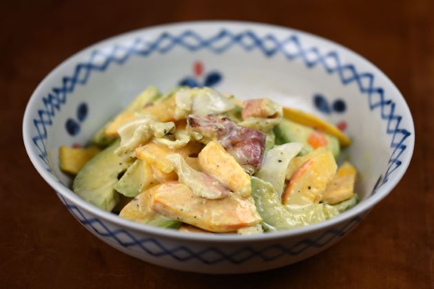 ホッキガイのサラダ(ウバガイのサラダ) 足の部分を開き、湯通しして冷水に落として粗熱を取る。水分をよくきり、適当に切る。野菜はアボカドが合う。ここではコリンキーと一緒にレモン、塩、オイル、マヨネーズを合わせたもので和える。マヨネーズとアボカドは本種とよく合う。クリックで閉じます![]()