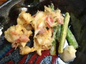 ホッキガイの天ぷら(ウバガイの天ぷら) むき身にして内臓を取る。水管、ヒモのの汚れを取り、とんとんと包丁目を入れる。軽く湯通しして、氷水に落として粗熱をとり、水分をよくきる。小麦粉をまぶして衣をつけて強火で短時間揚げる。クリックで閉じます![]()