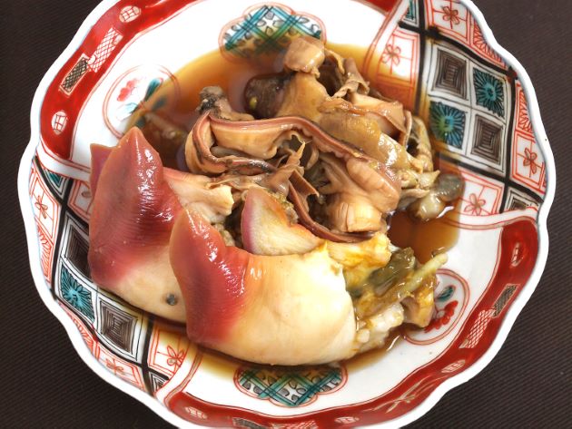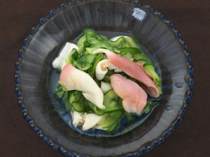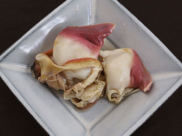 剥いてヒモや内臓を切り取り、塩水の中で砂などをていねいに流す。身(足)を開いて赤く染まるくらいにやや強めの塩水で湯引き、氷水に落としてぬめりをとる。水分をよく切り、大きさによっては半分に切る。軽く酢洗いしてもいい。