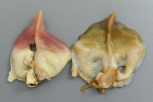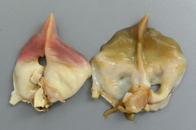 生殖腺の色(やや赤い乳白色-雄、乳白色-雌)。