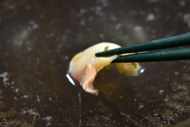 ホッキガイの刺身(ウバガイのゆびき) 完全な生でもおいしいが、軽く湯引きすると甘味や食感が増す。ボリューミーくせのない味わい。万人に好まれる味だと思っている。