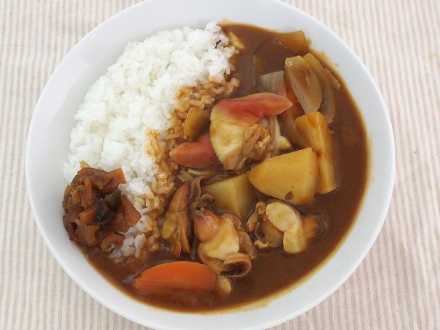 ほっきカレー(うばがいカレー) 昔は肉よりもホッキ(ウバガイ)の方が安かったため、産地でよく作られていた。剥き身にして適当に切り、野菜と一緒に炒めるときから加えて、後は普通にカレーを作る。軟体は硬くなるものの、貝をたっぷり使うとおいしい。[北海道苫小牧・白老、福島県浜通]クリックで閉じます![]()