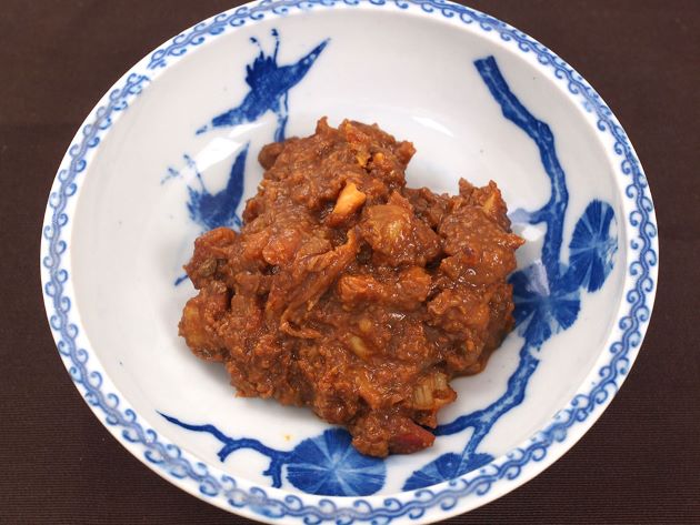 ほっきみそ(うばがいみそ) むき身を少量の水でゆで、身を取り出し、ゆで汁とみそを合わせて、水分を飛ばす。水分がなくなったら身(あし)、ひも、水管などを刻んで加える。身などを加えると水分が出るので加減が難しい。砂糖などで甘味を加えるとご飯に合う。[福島県相馬市原釜]クリックで閉じます![]()