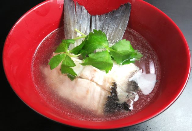 オキナメジナの潮汁 あらや頭部を使うとよい。適宜に切り、湯通しして冷水に落として鱗やぬめり、血液などを流す。水をよくきり、昆布だし(水でも)で煮だして酒と塩で味つけする。うま味豊かな汁が出来上がる。付着した身もとても味がいい。酒を飲んだ後などに最適である。クリックで閉じます![]()