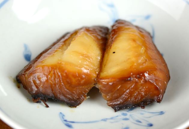 オキナメジナの祐庵焼き 水洗いして三枚に下ろす。水分をよくきり、酒・みりん・醤油同割りの地につけ込む。半日程度漬け込んでじっくりこがさいないように焼き上げる。みりんを塗りながら焼くとキレイに仕上がる。ほんのり甘く、お弁当の菜などに向いている。クリックで閉じます![]()