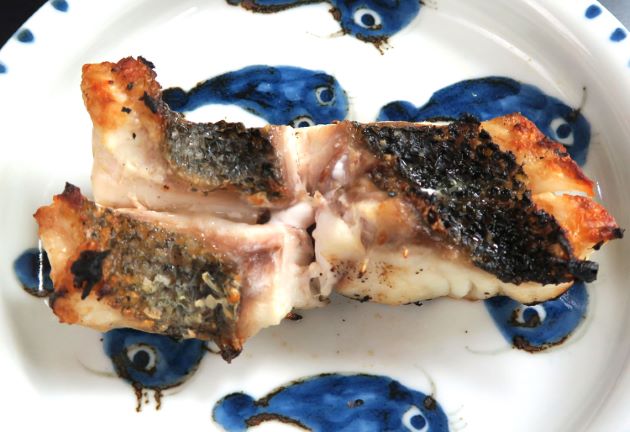オキナメジナの酒塩煮 頭部を半割にして湯に通す。冷水に落として残った鱗やぬめりなどを流す。これを酒と塩、水で煮る。皮はゼラチン質になり、身も適度にしまる。煮だした汁も実にすばらしい味。ほぐした身を汁につけながら食べる。汁と煮ものとの中間的なものだ。クリックで閉じます![]()