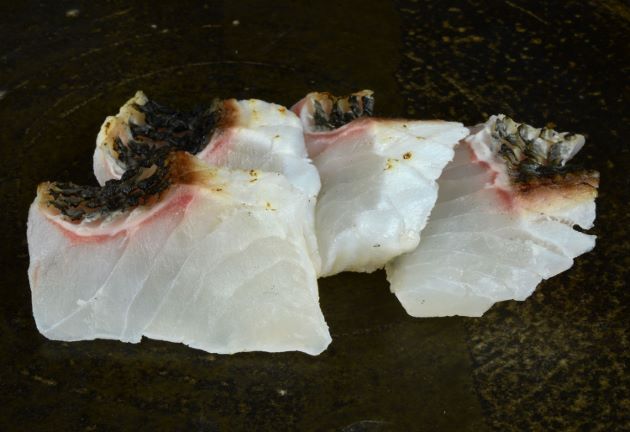 オキナメジナの刺身 8月初旬の個体は脂がのっていて臭みなどは皆無だった。水洗いして三枚に下ろす。腹骨・血合い骨を取り、皮を引いて刺身状に切る。買い求めて2日目だったのでやや厚めに切る。脂の甘味が感じられる。身にうま味があり、食感が心地よい。