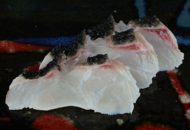 オキナメジナの焼霜造 水洗いして三枚に下ろす。腹骨・血合い骨を取る。水分をよくきり、皮目をバーナーなどであぶり、氷水に落とす。水分をよくきり少し置いて皮目を落ち着かせる。これを刺身状に切る。皮周辺にうまみがある。身にも豊かなうま味があって非常にうまい。クリックで閉じます![]()