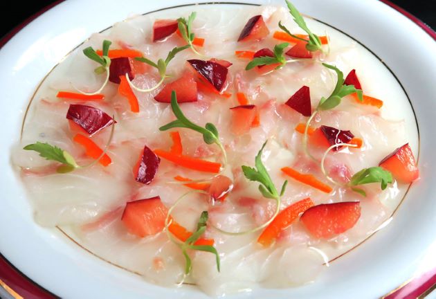 オキナメジナのカルパッチョ 刺身がいちばんうまいが、大きい個体ならカルパッチョにしてもいい。三枚に下ろして皮を引く。できるだけ薄く切りつけておく。皿ににんにくの香りづけをするか、すってオリーブオイル(好みの油でいい)とともに広げる。振り塩をして切り身を並べていく。並べ終わったらスプーンなどでとんとんと叩いて馴染ませる。上からもオリーブオイルをかけ回し、振り塩をする。上に飾る野菜はなんでもいい。クリックで閉じます![]()