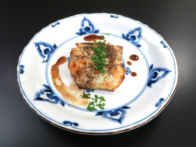カスリハタの兜煮(かぶとに) あら煮がうまいのはハタ科ならでは。特に兜の部分のうまさは出色のものだと思う。やや水分を多くしてできるだけ軟らかく仕上げるのがコツかも。頬などは締まって鶏肉のようだし、胸鰭の肉のうまさたるや文字にしがたい。