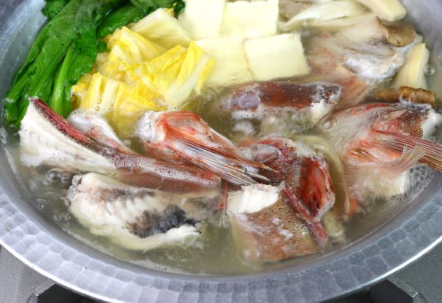 カナガシラのちり(水炊き) 頭部などからとてもいいだしが出る。身自体・皮にもうま味があるので、鍋材料としてこれ以上のものはない。